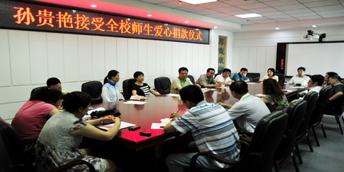 2014年7月4日上午11:30,在行政楼四楼会议室举行“孙贵艳接受全校师生爱心捐款”仪式。出席会议的有多盈在线手机版下载党委书记、校长徐兆东同志,多盈在线手机版下载纪检书记赵凯同志,多盈在线手机版下载工会主席曹丽萍同志,全校16个党总支和支部书记以及图书馆教师孙贵艳本人。