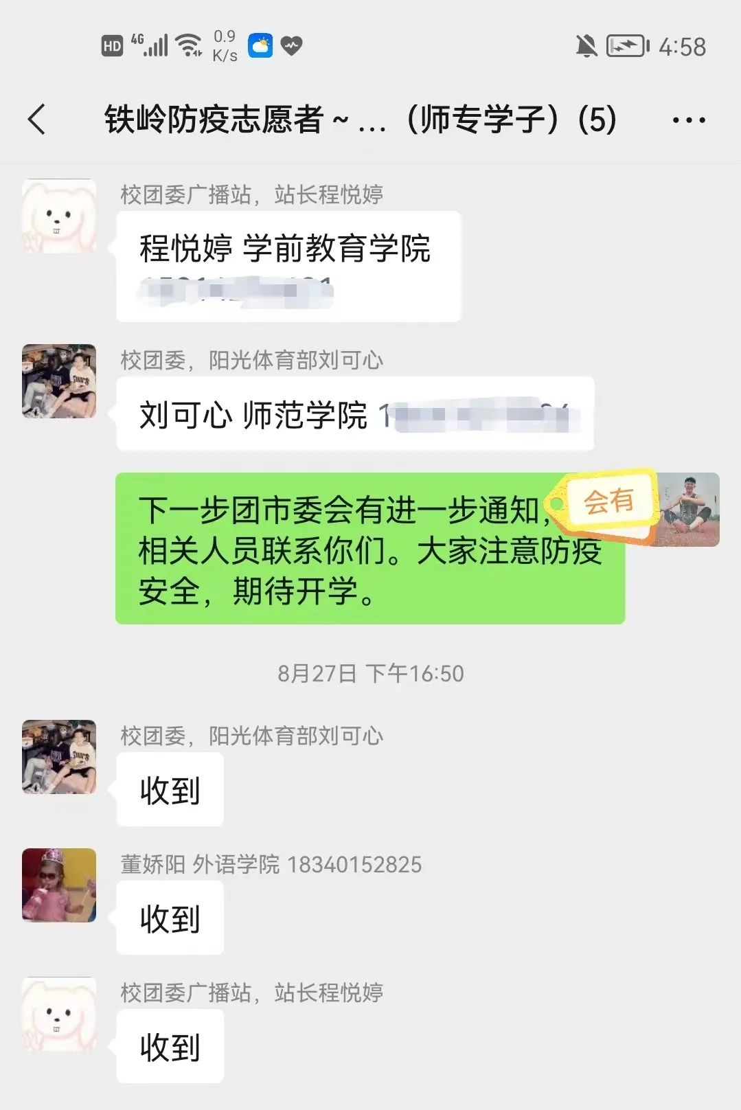 外语学院董娇阳、师范学院刘可心、学前教育学院程悦婷三位同学,在铁岭市银州区民生热线急需志愿者接听记录百姓诉求电话志愿者时,积极响应团市委的号召,第一时间报名参加。以坚定的政治立场,崇高的志愿服务精神,为有效助力疫情防控工作,作好后备力量。