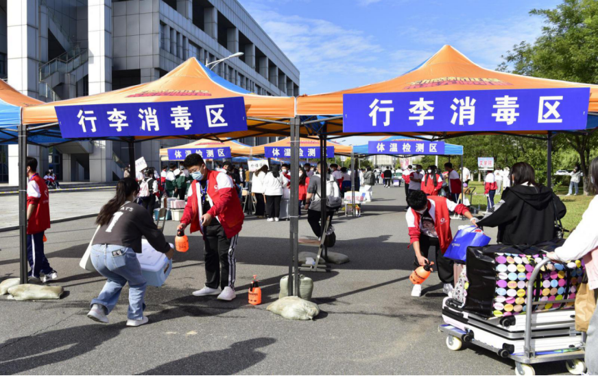 新生进入校园要经过消毒、测量体温、登记、查看健康码等流程。